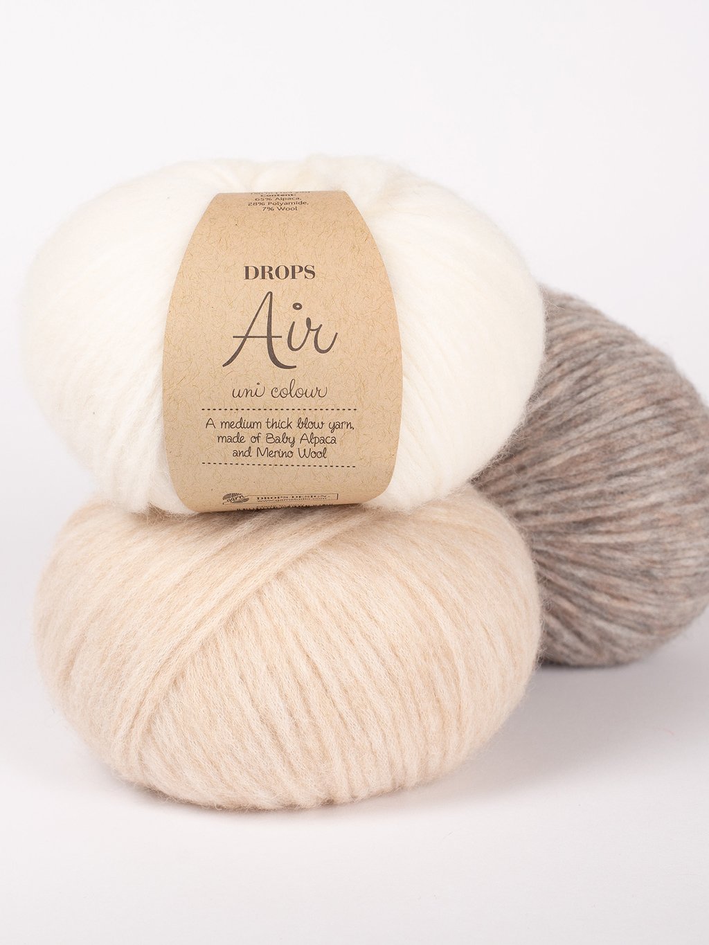 DROPS Air je výjimečná „blown yarn“ příze vyrobená z jemné baby alpaky a hřejivé merino vlny. Díky své unikátní konstrukci se vlákna nepřádou klasickým způsobem, ale jsou vyfukována do tenké trubičky, což dává přízi její charakteristickou lehkost a nadýchanost.